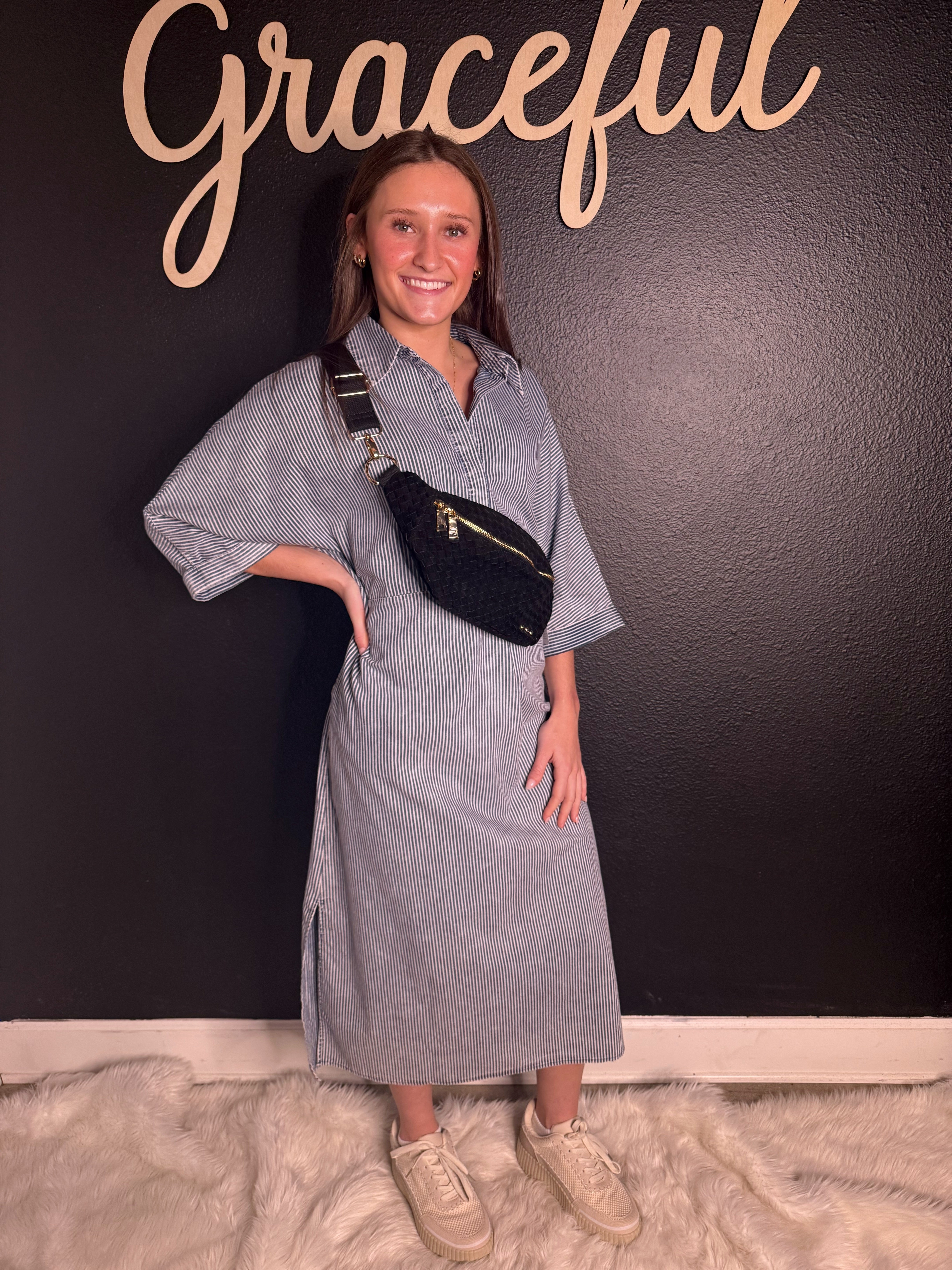 The Bluebell Dress brings effortless charm to your wardrobe with its timeless striped pattern and flattering silhouette. This long dress features elegant elbow sleeves that strike the perfect balance between coverage and breathability, making it ideal for everything from casual outings to semi-formal occasions. The vertical stripes create a lengthening effect that's both slimming and sophisticated. Whether you're dressing up for a special event or keeping things relaxed on the weekend, this versatile piece pairs beautifully with sneakers, sandals, or heels. A wardrobe essential that transitions seamlessly through seasons and styles.