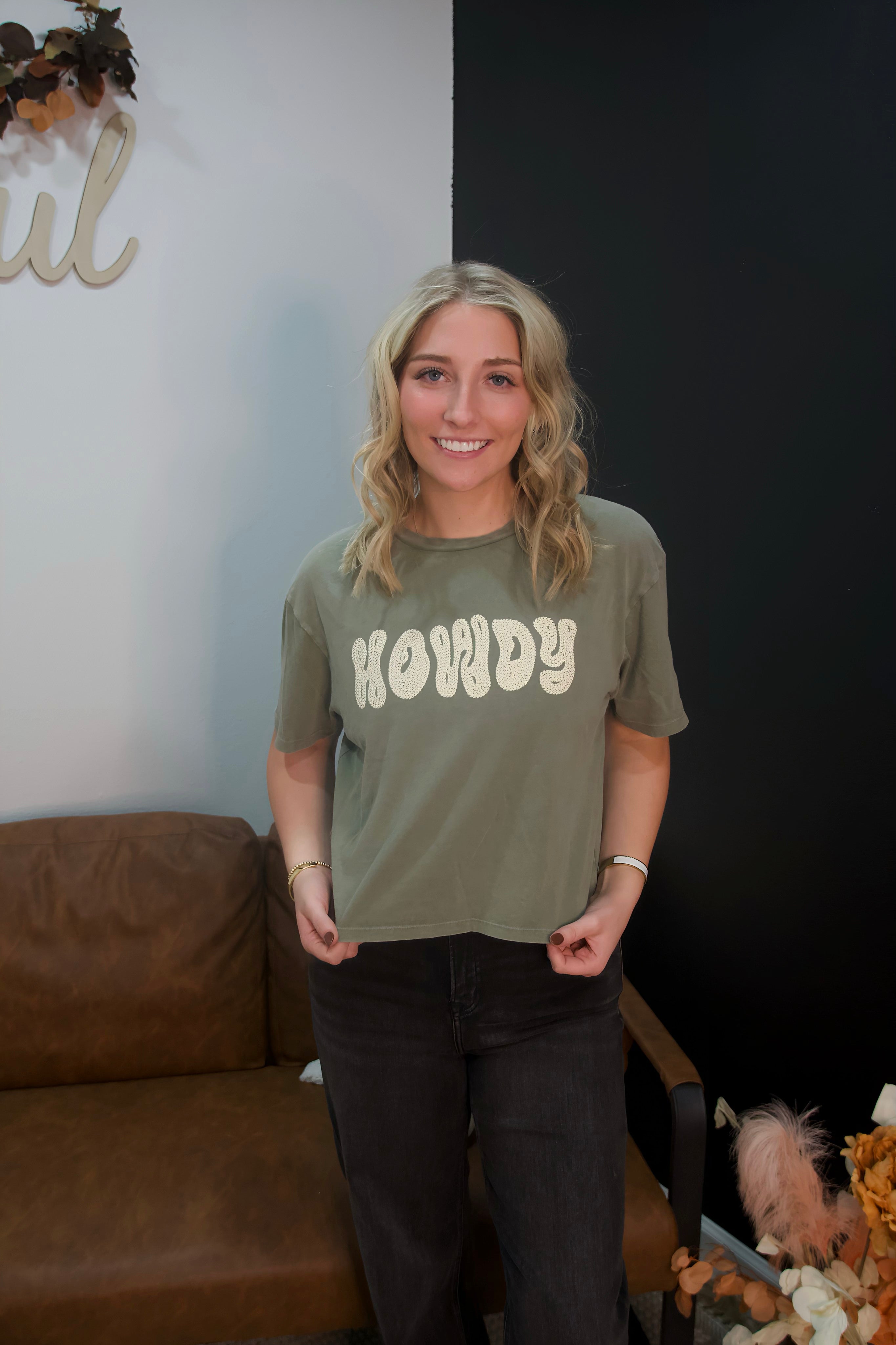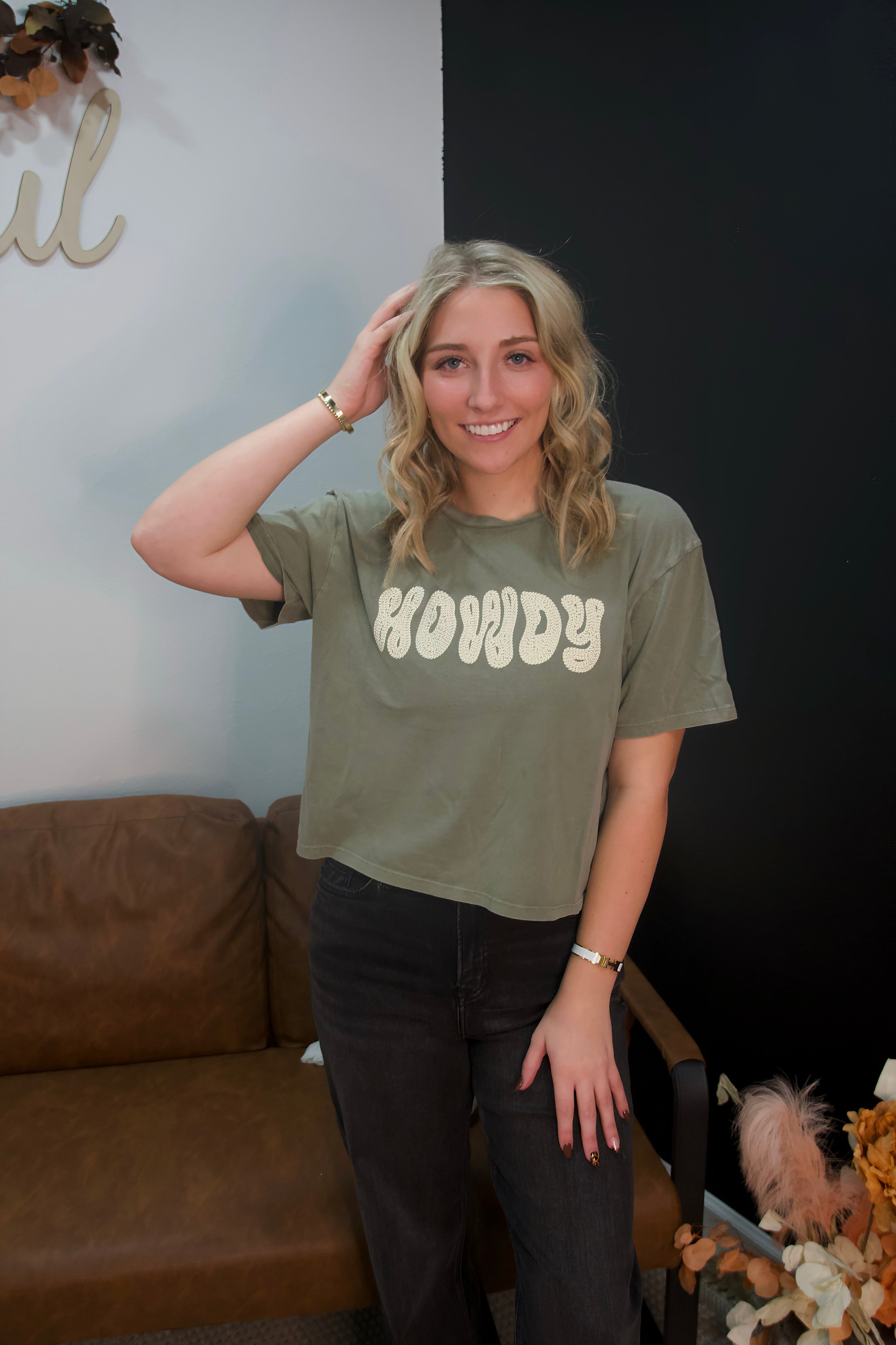 The Howdy Graphic top brings a playful twist to your wardrobe with its breezy, flowy fabric and flattering cropped fit. Perfect for layering or rocking solo, it adds a dash of fun to any outfit while keeping you comfy and cool all day long.