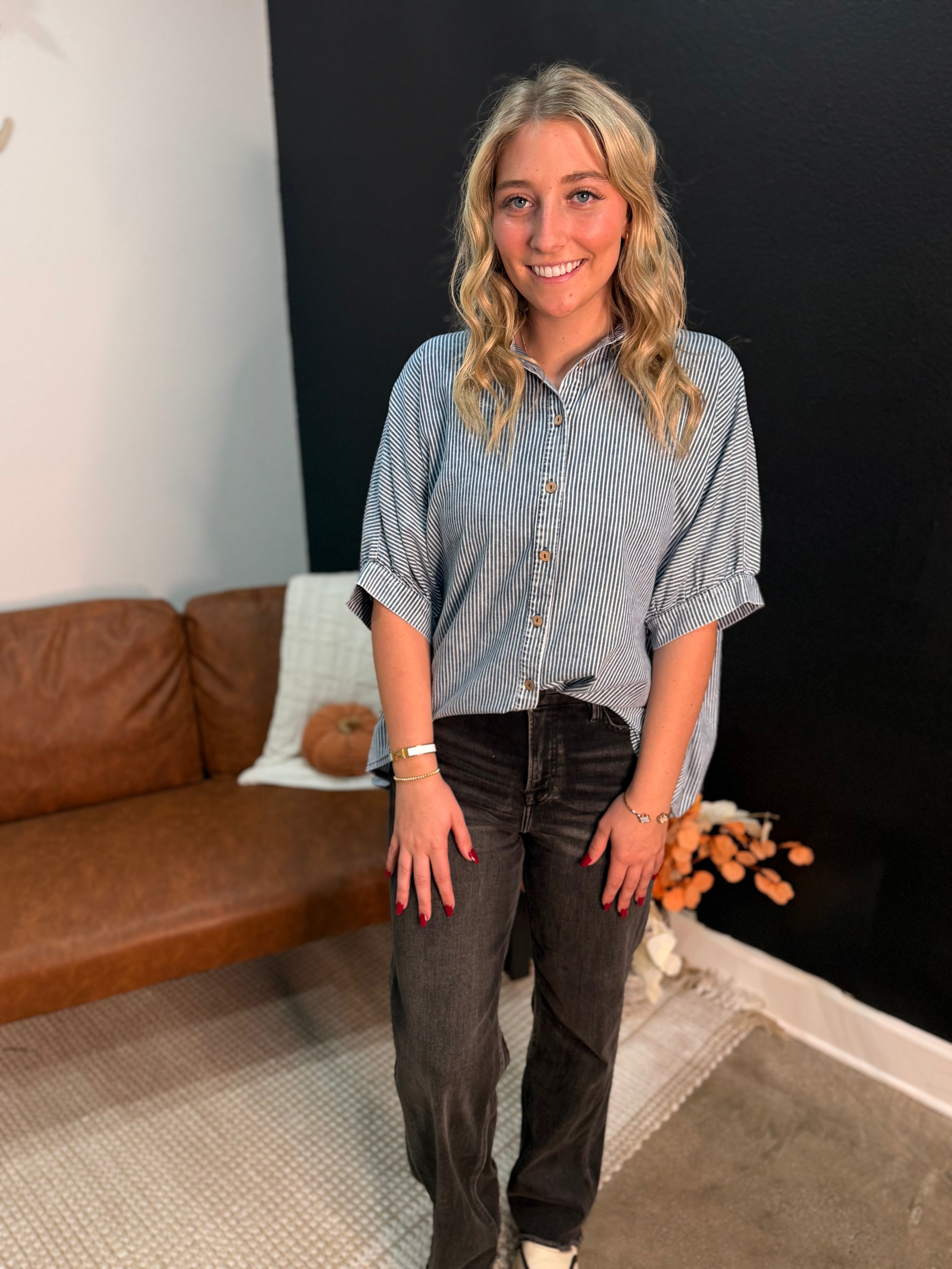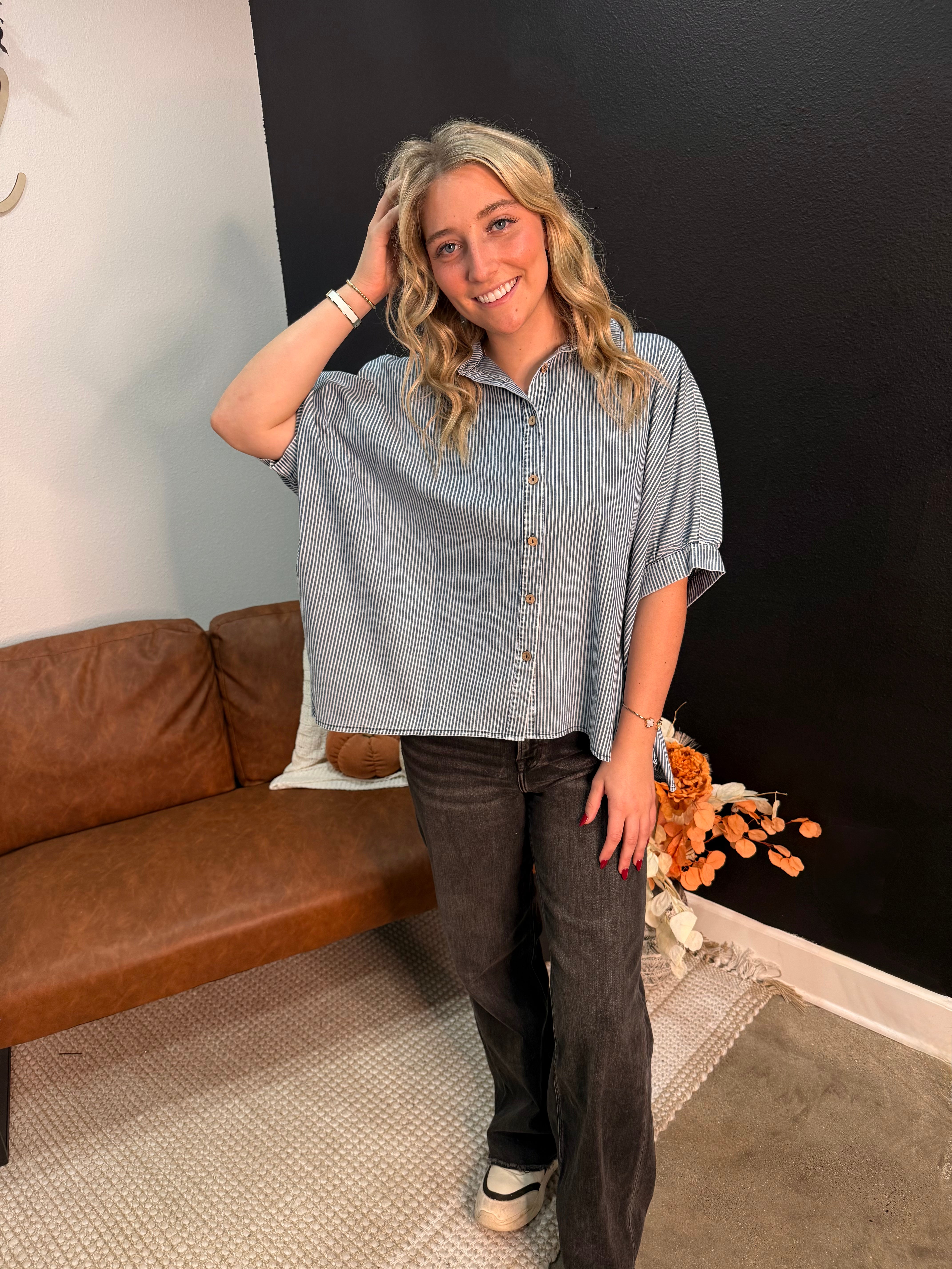 Bring effortless charm to your wardrobe with the Parker Button Down. Crafted from washed striped cotton chambray, this collared shirt features playful short dolman sleeves with banded cuffs and a breezy oversized fit. The button-down front and pleated detail on the back add a touch of personality, making it perfect for days when comfort meets style.