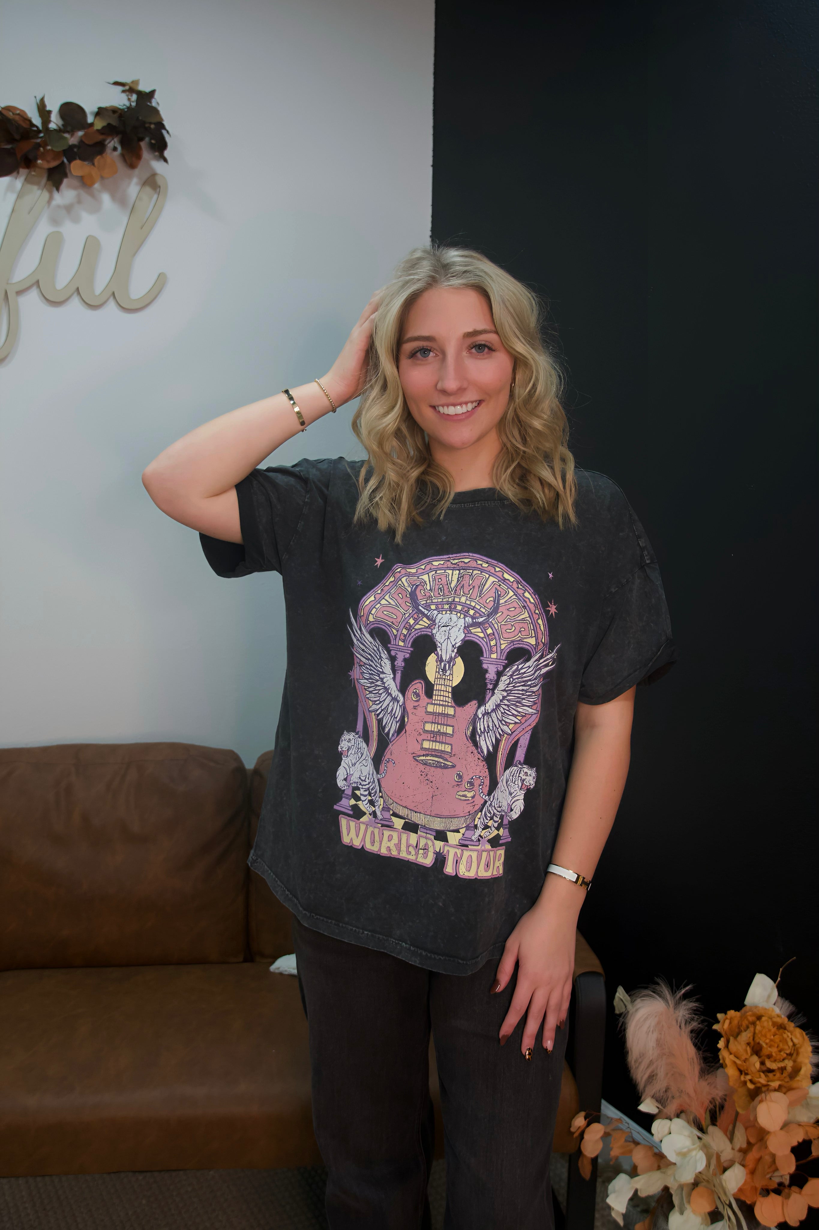Embrace effortless cool with the World Rock and Roll tee. Featuring an oversized graphic and a soft mineral wash, this shirt combines vintage vibes with modern comfort. Perfect for turning heads and rocking your style all day long.