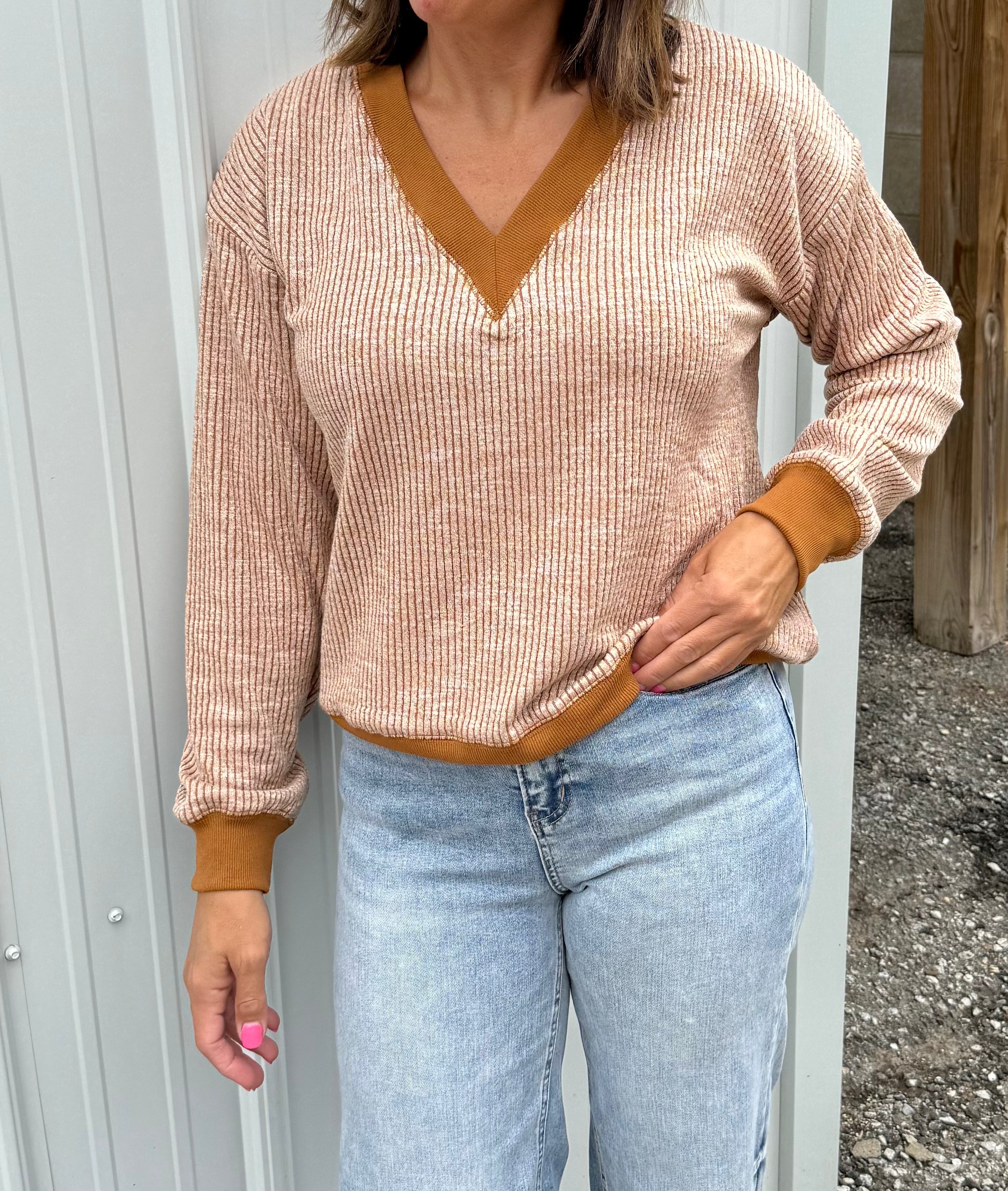 Embrace cozy vibes with the Quinn Sweater, featuring an oversized fit that drapes just right for ultimate comfort. The playful V-neck trimmed in contrasting hues adds a fun pop, while reverse stitch details give it a cool, textured twist. With dropped shoulder seams for that perfectly slouchy look, this two-tone ribbed top delivers relaxed style with a fresh, vertical stripe flair. Perfect for days when you want to feel comfy but make a statement!